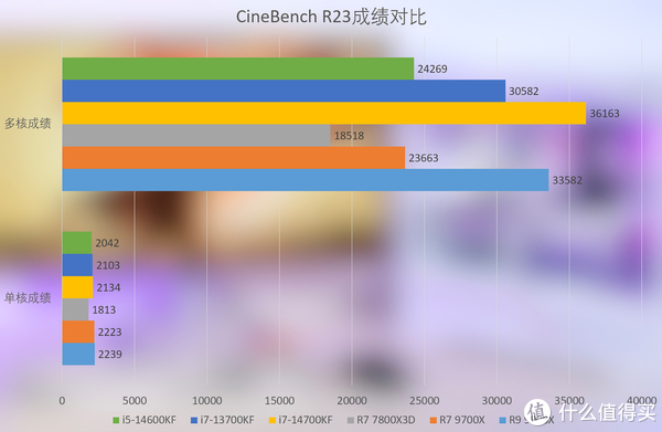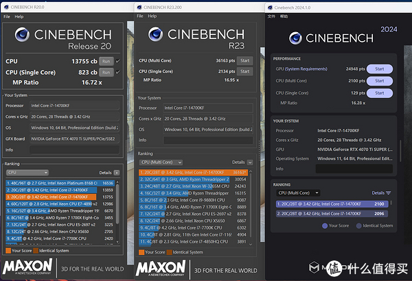接下来进行基准性能测试,CineBench系列基准测试软件,英特尔酷睿i7-14700KF处理器在R20版本中的多核成绩为13755分,单核成绩为823分,R23版本中的多核成绩为36163分,单核成绩为2134分,2024版本中的多核成绩为2100分,单核成绩为129分。
