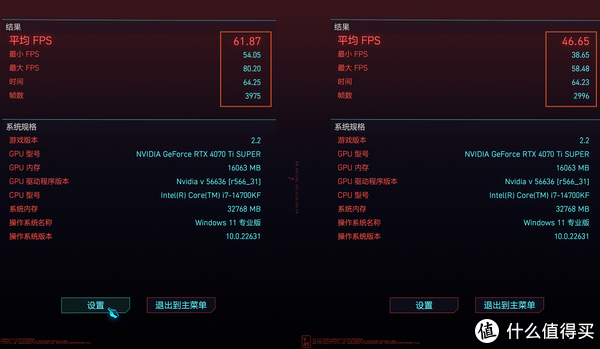 在《赛博朋克2077》游戏2.2版本中,选择最高的超级预设画质档位,并开启DLSS超级采样功能质量档位,其它画质参数均保持默认,基准测试的平均帧率为61.87FPS,最小帧率为54.05FPS,若是关闭DLSS超级采样功能,平均帧率会降至46.65FPS。