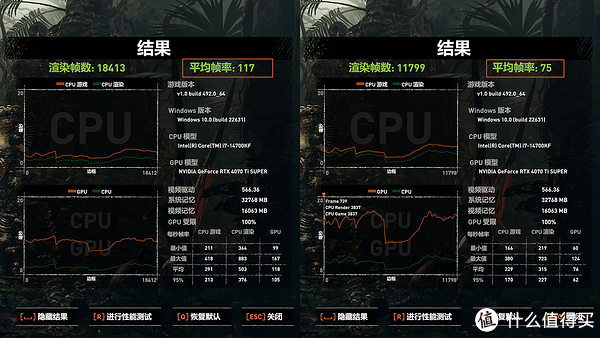 在《古墓丽影:暗影》游戏中选择预设最高画质档位,全部画质参数均为默认,无DLSS超级采样,游戏内置基准测试的平均帧率为117FPS,若是将各项画质参数拉满,并开启最高档的光线追踪阴影质量,平均帧率会降至75FPS。