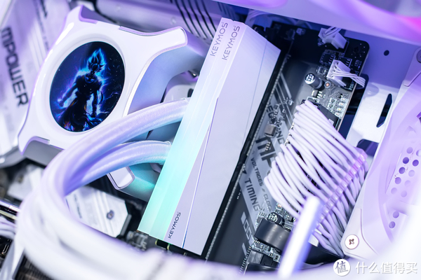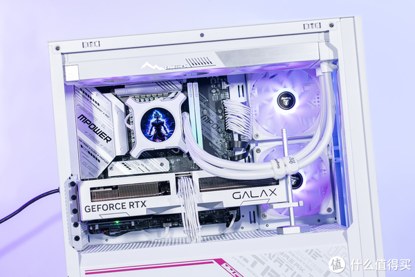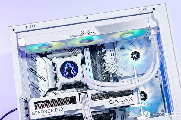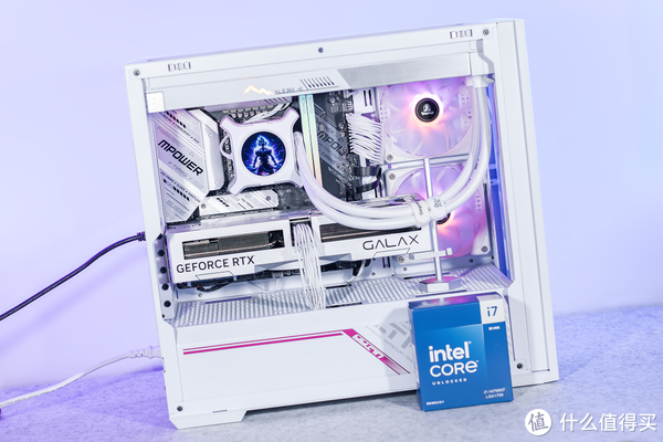 主板是微星的Z790MPOWER,MATX尺寸规格双内存插槽,若是白色PCB板就更好了,i7-14700KF处理器还是建议搭配Z790芯片组的主板,在供电能力与内存频率上限更高,能搭配更高频率的内存条进一步释放性能,预算较低的完全可以搭配B760芯片组的主板,在接口扩展性上大差不差,实际装机效果,全白海景房的颜值相当耐看,若是改为单色灯效素颜也不错。