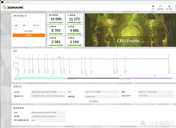 3DMark基准测试软件中CPU Profile项目,可以测试处理器在不同线程数之下的性能表现,i7-14700KF处理器在最大线程成绩为15000分,16线程成绩为11575分,8线程成绩为8705分,4线程成绩为4686分,2线程成绩为2381分,单线程成绩为1196分。
