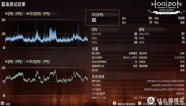 在《地平线 零之曙光重制版》游戏中,选择极高预设画质档位,关闭DLSS超级采样、动态分辨率缩放与帧生成等功能,实测基准测试平均帧率为86FPS,最低帧率为37FPS。