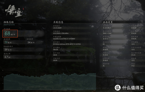 在实际当中不倾向使用这套推荐设置等级方案,一般会自行修改部分参数以获得更高的画面清晰度与效果,比如在游戏中开启DLSS超分辨率采样,85超采样清晰度(质量档),关闭帧生成,除了将阴影质量与全局光照两个选项设为高,其它画面质量选项均设为影视级,此时的平均帧率为68FPS,最低帧率为54FPS,若是开启垂直同步功能,在实际游戏中能稳定在60FPS。