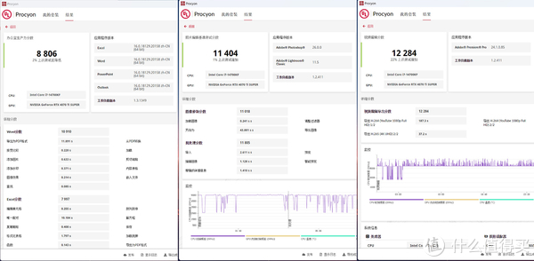 UL Procyon基准性能测试套件,利用Office与Photoshop相应的软件进行模拟操作,分别测试办公室生产力、照片编辑基准测试与视频编辑三个项目,在办公生产力测试项目中的测试成绩为8806分,照片编辑基准测试中成绩为11404分,视频编辑成绩为12284分。