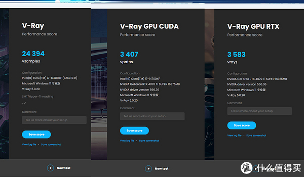 V-Ray Benchmark基准测试软件5.0.2版本,可测试处理器和显卡的渲染性能表现,显卡需要支持CUDA加速功能,本次测试三种不同渲染测试,处理器单独渲染测试的成绩为24294分,处理器与显卡混合渲染测试项目成绩为3407分,显卡单独渲染成绩为3583分。