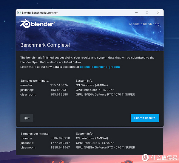Blender BenchMark基准测试软件4.30版本,同样能测试处理器和显卡的渲染性能,目前提供monster、junkshop与classroom三个不同的渲染测试场景,酷睿i7-14700KF处理器渲染测试成绩分别为215.5、153.8与105.6分,显卡渲染测试成绩就大幅领先于处理器。