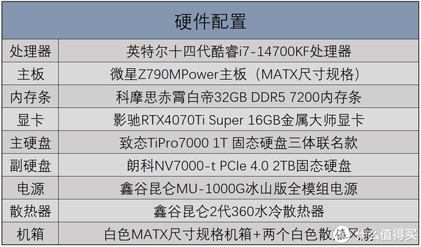 主机详细硬件配置方面,其中包括英特尔酷睿i7-14700KF处理器,微星的Z790MPOWER主板,影驰的RTX4070Ti Super金属大师显卡,科摩思赤霄白帝32GB DDR5 7200内存条,鑫谷昆仑2代360水冷散热器,鑫谷昆仑MU-1000G冰山版电源,两个满速的PCIe4.0固态硬盘,以及白色MATX尺寸规格的玻璃侧透机箱,并配了两个散热风扇将显卡的热风吹出。