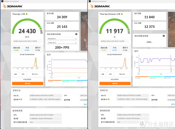 3DMark软件中的Time Spy项目测试2K分辨率下的性能表现,综合得分为24430分,其中CPU得分为25143分,图形得分为24309分,Time Spy Extreme测试4K分辨率的性能表现,综合得分为11917分,其中CPU得分为12373分,图形得分为11184分。
