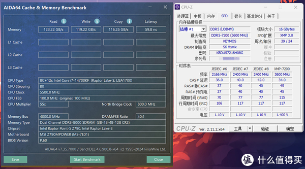 实测在8000MT/s频率下能通过稳定性压力测试,此时内存条的各项性能均得到较明显的提升,读取速度为123.22GB/s,写入速度为119.22GB/s,复制速度为116.25GB/s,延迟为59.8ns,这是主板内置的超频参数配置,其实还可手动去细调优化时序参数将延迟降低。