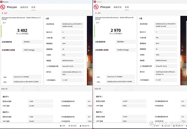 UL Procyon软件中的AI图像生成基准测试,Stable Diffusion1.5项目是生成16幅512×512分辨率图像,成绩为3402分,平均1.837秒生成一张图片,Stable DiffusionXL项目是生成16幅1024×1024分辨率图像,测试成绩为2970分,平均12.625秒生成一张图片。
