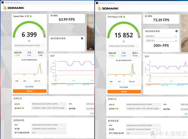 显卡的光线追踪性能测试,Speed Way项目中得分为6399分,帧率为63.99FPS,Port Royal项目得分为15852分,帧率为73.39FPS,以RTX4070Ti Super显卡的性能水平,在游戏中也可尝试开启光追。