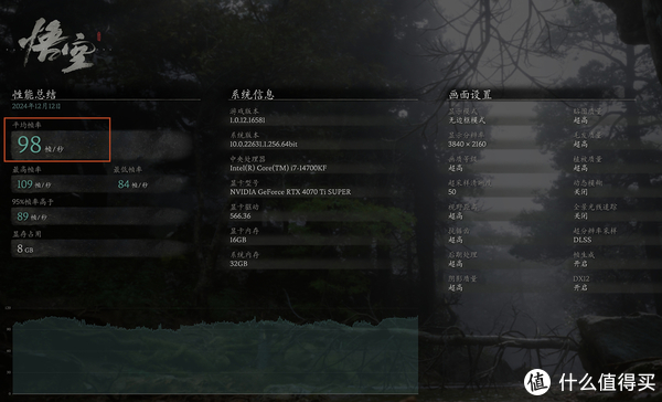 实际游戏性能测试环节,以下全部游戏测试均在4K(3840×2160)分辨率下进行的,先来测试国产游戏大作《黑神话:悟空》,在TGA中获得年度“最佳动作游戏”和“玩家之声”两个奖项,在游戏中开启DLSS超分辨率采样,50超采样清晰度,并开启帧生成,其它画面质量选项均设为超高,无全景光线追踪效果,游戏内置基准测试的平均帧率为98FPS,最低帧率为84FPS。