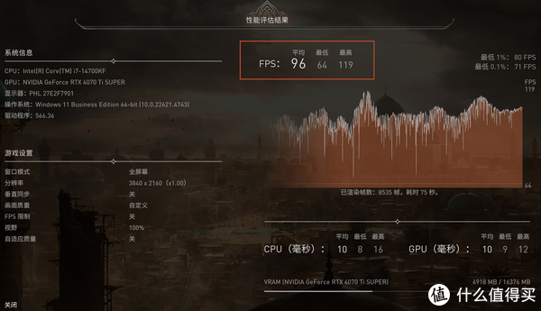 在《刺客信条:幻景》游戏中选择极高预设画质档位,关闭DLSS超级采样与自适应质量功能,即以4K原生分辨率进行图形渲染,其它画质选项均为默认,游戏内置基准测试的平均帧率能达到96FPS,最低帧率为64FPS,1%Low帧为80FPS。